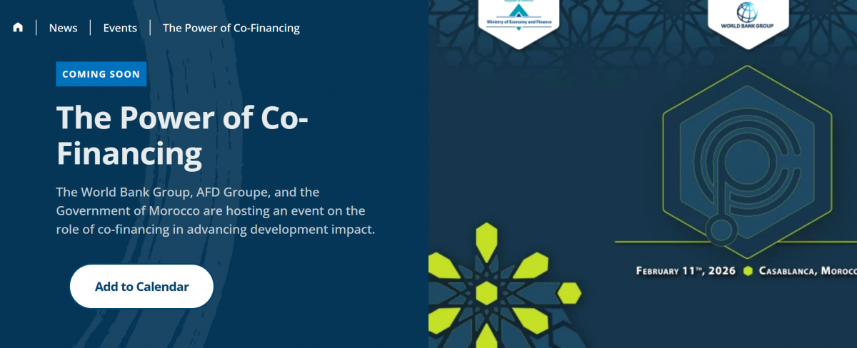 Co-hosted by the World Bank Group, AFD Groupe, and the Government of Morocco, the event will showcase real-world co-financing experiences from both public and private sectors. Through high-level dialogue and field-based examples, participants will examine what it takes to make co-financing work in practice and identify opportunities to strengthen future partnerships.