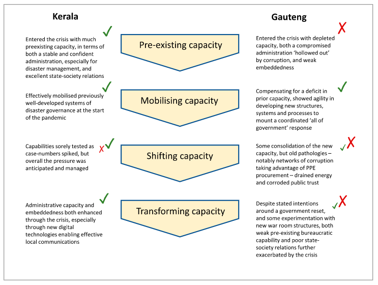 With the COVID-19 pandemic, critical questions have surfaced in several countries regarding the capacity of the state to respond with agility to the crisis, and to use the crisis in a transformational way over the longer term. These questions are addressed in a comparative study of the State of Kerala in India and the Province of Gauteng in South Africa. The study contributes to two partial gaps in the literature: