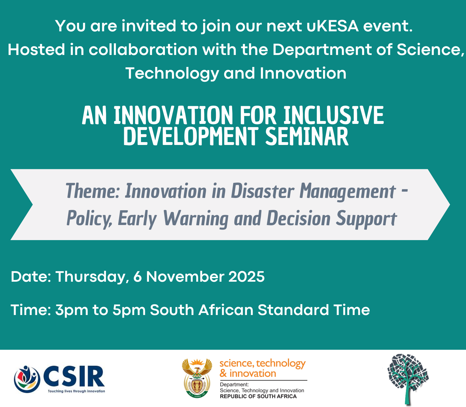 - uKESA Seminar, hosted as part of the DSTI's Innovation for Inclusive Development -Innovation in Disaster Management: Policy, Early Warning & Decision-Support - November 2025