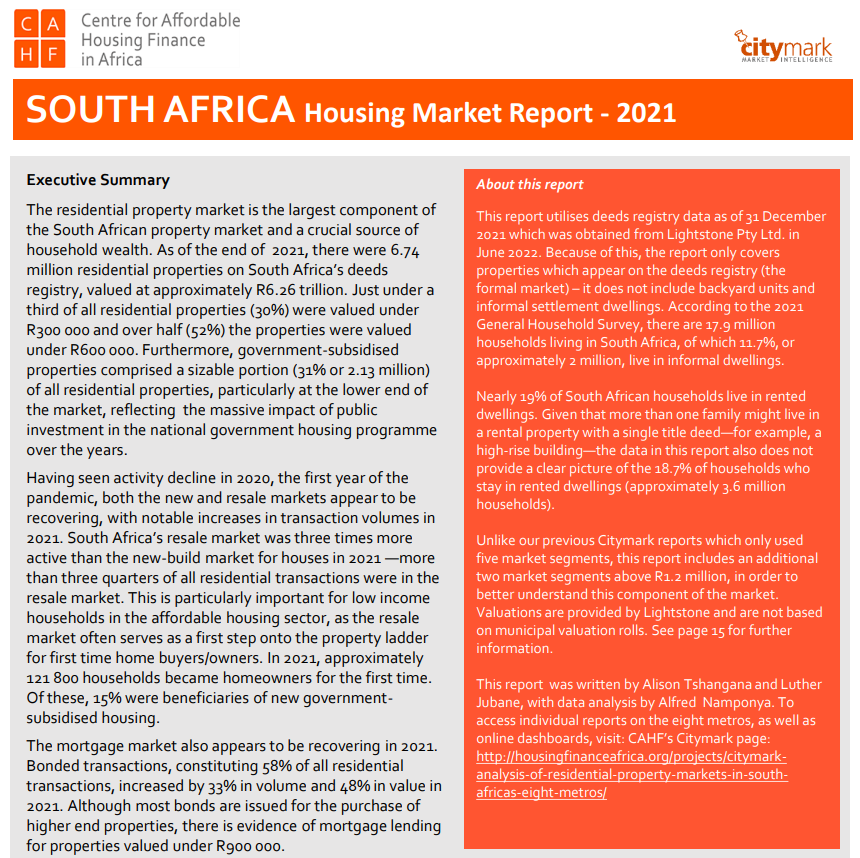 This report utilises deeds registry data as of 31 December 2021 which was obtained from Lightstone Pty Ltd. in June 2022. Because of this, the report only covers properties that appear on the deeds registry (the formal market) – it does not include backyard units and informal settlement dwellings. According to the 2021 General Household Survey, there are 17.9 million households living in South Africa, of which 11.7%, or approximately 2 million, live in informal dwellings. Nearly 19% of South African households live in rented dwellings.